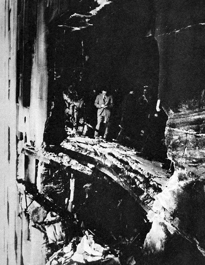 Сила удара была такова, что один из двигателей бомбардировщика, оторвавшись от корпуса, пролетел через весь небоскреб, пробил южную стену и приземлился на крыше здания в соседнем квартале 270 метрами ниже. Обломки самолета оборвали трос одного из лифтов внутри башни, после чего лифтовая кабина пролетела 75 этажей и оказалась в подвале, но каким-то чудом находившаяся внутри лифтер Бетти Лу Оливер выжила, отделавшись травмами. Увы, так повезло не всем. В результате удара, взрыва и последовавшего пожара погибли не только три члена экипажа, но и 11 человек, находившихся в офисе Национального совета католической помощи, в окна которого и угодил B-25 Mitchell. К счастью, катастрофа не привела к нарушению конструктивной целостности Empire State Building, а начавшийся пожар удалось достаточно быстро, всего за 40 минут, потушить. Поврежденный фрагмент небоскреба восстановили, и здание по-прежнему является одним из архитектурных символов Нью-Йорка.