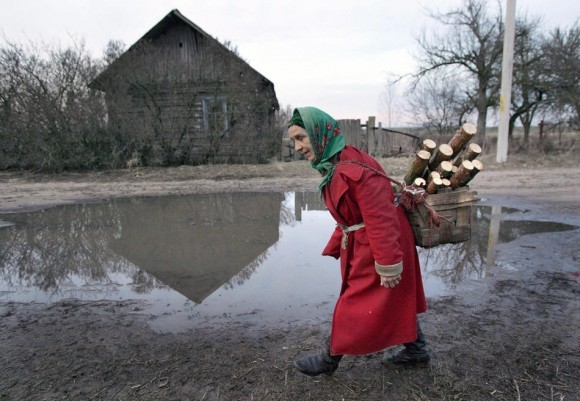 Женщина с поросятами в опустевшей белорусской деревне Тульговичи в 370 км к юго-востоку от Минска, 7 апреля 2006 года. Эта деревня находится в пределах 30-километровой зоны вокруг ЧАЭС. (AFP PHOTO / VIKTOR DRACHEV)