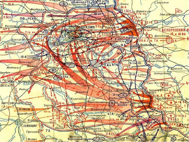 | 16 апр. — 2 мая 1945г. | Берлинская операция. Части Красной армии находились в 60км от Берлина, передовые части союзников вышли на реке Эльба в 100—120км от Берлина. |