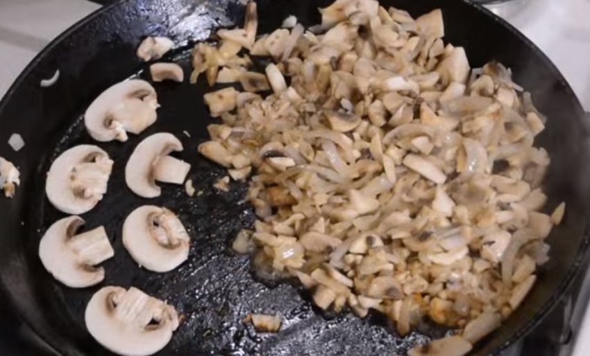В другой большой сковороде нагрейте 1/4 стакана оливкового масла и обжарьте нарезанный кубиками лук до коричневого цвета. Добавить нарезанные грибы к луковой смеси и обжарить вместе с приправой, щепоткой соли и перца до готовности. Поместите приготовленную смесь в большую миску и отставьте.