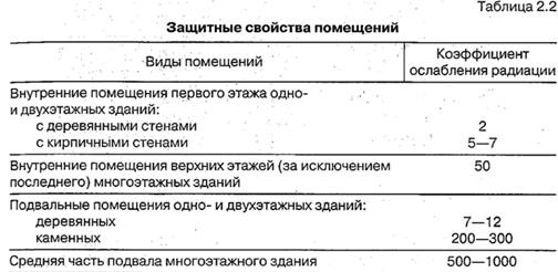 Защитные свойства противорадиационных укрытий от воздействия радиоактивных излучений оцениваются коэффициентом защиты (ослабления радиации), который показывает, во сколько раз доза радиации на открытой местности больше дозы радиации в укрытии, т.е. во сколько раз ПРУ ослабляют действие радиации, а следовательно, дозу облучения людей. Защитные свойства некоторых помещений приведены в табл. 2.2.