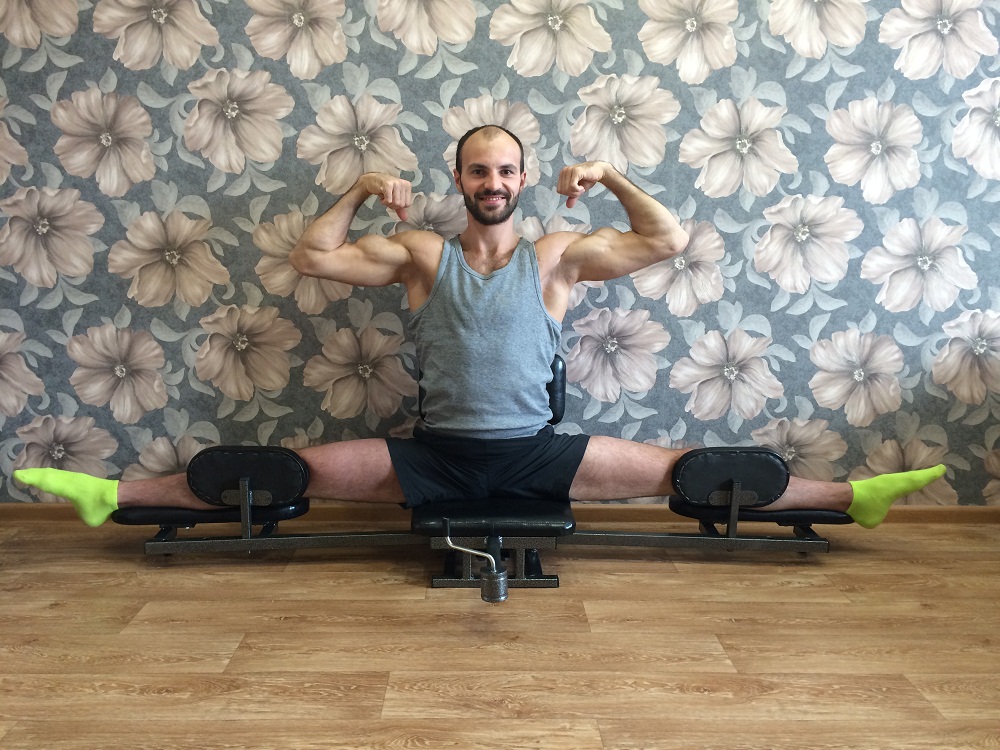Как выполнять: Поставьте ноги максимально широко друг от друга, в начальное положение поперечного шпагата. Наклонитесь вперед и тянитесь руками вниз. Не сутульте спину. Продвинутые могут попытаться поставить на пол предплечья. Упражнение делайте на нескользком полу, иначе появляется риск травмы. Упражнение отлично раскрывает тазобедренные суставы.