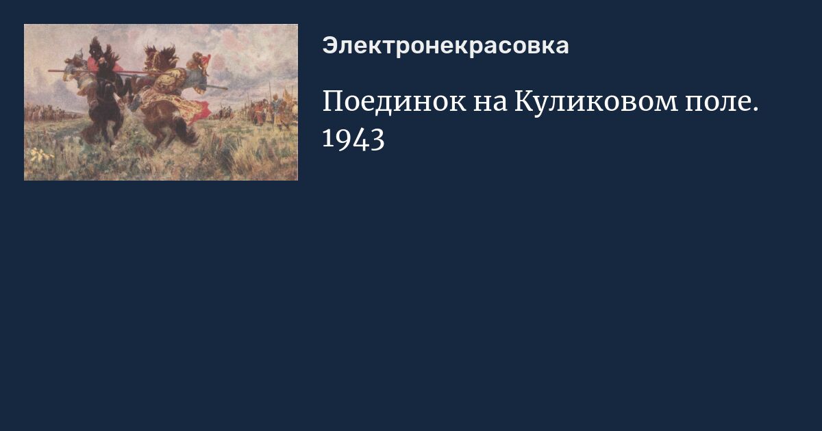 Потом пришел советский период, соцреализм, а вместе с ним и его классика.Например, так известная всем по школьной картина Авилова Михаила Ивановича (1882-1954) «Дуэль на Куликовом поле», написанная в 1943 г.