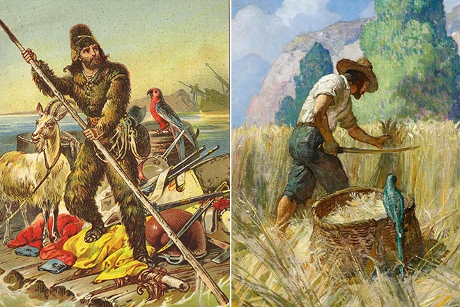 Робинзон Крузо на необитаемом островеСамой необходимой вещью для Робинзона стал ящик плотника, который в то время он не променял бы на целый корабль, наполненный золотом. Крузо понял, что пребывать на необитаемом острове ему придется далеко не один месяц и даже не один год, поэтому стал обустраивать территорию: Робинзон засеял поля крупами, а прирученные дикие козы стали источником мяса и молока.