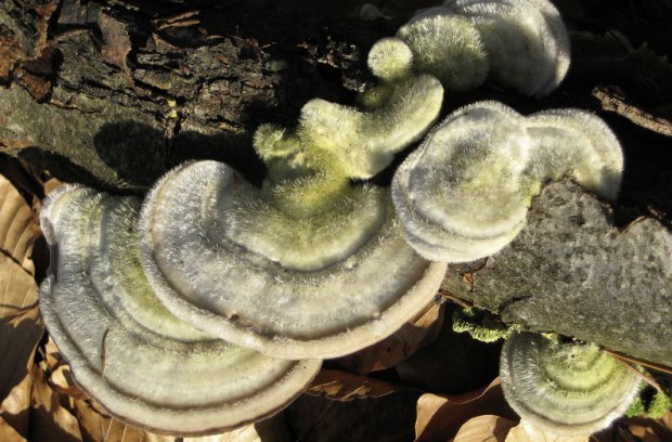 - Жестковолосистый. Имеет полукруглую шляпку, которая покрыта жёсткими ворсинками серого цвета длиной до 5 мм. Они растут пучками и вверх. Помимо лиственных деревьев, такие грибы способны поселиться также на деревянных заборах и строениях.