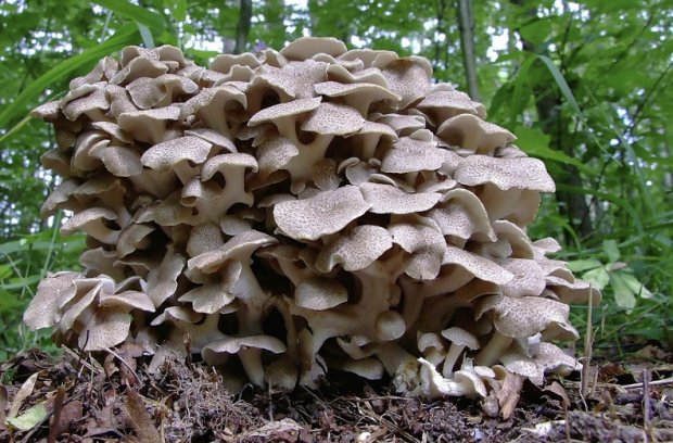 - Зонтичный. Диаметр плодового тела достигает 20 см. Состоит из разветвлённых ножек, которые имеют соединение у основания. Его шляпки округлой формы имеют углубление в центре. Они гладкие и буроватого оттенка. Мякоть отличается специфическим запахом укропа. Как правило, развивается в широко- и хвойно-лиственных лесах, на пнях клёна, дуба или у основания других деревьев, кроме хвойных. Его веретеновидные споры бесцветны и имеют гладкую поверхность. Гриб способен вызывать белую гниль, а плодоносит он с июля по август.