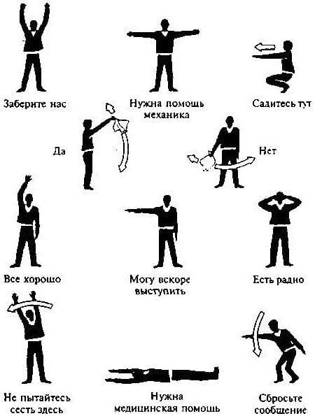 В частности: «Спасательный линь ракеты удержан». «Блок со свитнем закреплен». «Человек в спасательной беседке». «Выбирай ходом»