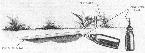 Устройства для стрельбы минами, c. 1941: Нажать, потянуть и отпустить переключатели; серийно выпускаемые комплектующие, предназначенные для создания мин-ловушек. Югославская противопехотная мина ПОМЗ, заминированная ручной гранатой. Сапер мог вывести из строя мину с колышками только для того, чтобы взорвать ручную гранату, когда они извлекут мину для утилизации. (Балканы, 1996 г.)Военная мина-ловушка может быть предназначена для убийства или ранения человека, который активирует ее спусковой крючок, или может использоваться для обнаружения местоположения врага путем срабатывания сигнального устройства. Большинство военных мин-ловушек, но не все, содержат взрывчатку.