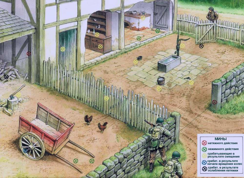 Заметки на полях. Мина предельно проста в обращении и не требует никаких подготовительных действий. Достаточно открутить красный колпачок и резко дернуть. Все. Через 2 минуты мина в боевом положении. Достаточно большой заряд взрывчатки гарантирует детонацию мины, под которой установлена эта ловушка.