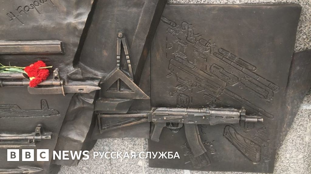 На металлическом барельефе за статуей Калашникова изображен АК-47 и другое оружие, которое, как утверждается, было разработано инженером, который умер в 2013 году.