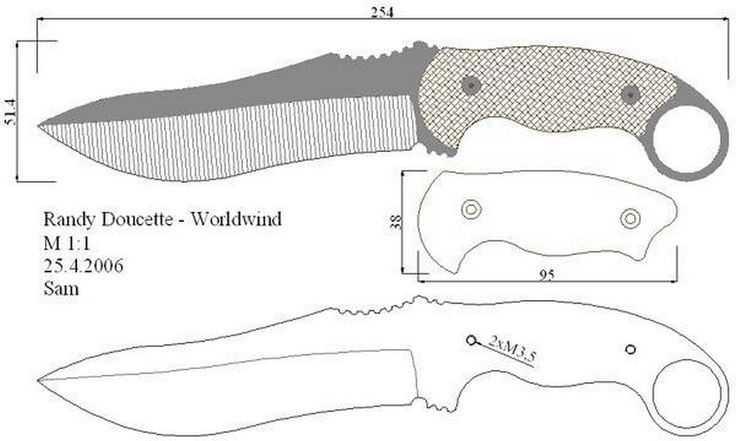 д.). После этого начинается трудоемкий процесс по выпиливанию, который осуществляется наждаком или напильником. В последнем случае можно зажать стальной лист тисками с алюминиевыми прокладками. Особое внимание следует уделить «хвостику», длина которого должна быть достаточной для максимальной фиксации клинка в рукоятке.