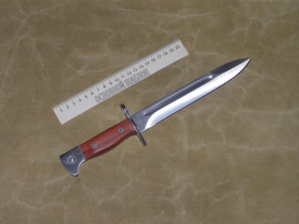 Иногда приходится на показательных выступлениях по рукопашке пользовать его. Этот штык-нож делался ещё с оглядкой на опыт военных действий Великой Отечественной. Сам он очень сильно напоминает штык-нож к самозарядной винтовке Токарева СВТ-38, СВТ-40, только немного короче. В руке сидит изумительно. Когда работаешь им в рукопашке, понимаешь, что такая длина клинка была взята отнюдь не случайно (кто практикует Систему Кадочникова, тот поймёт о чём речь). Балланс на высоте. Сталь мягче, нежели у АКМовского и у 74-го, а поэтому не ломается, даже когда весьма жёстко падает на асфальт или бетон на клинок. Взяв его в руки, сразу чувствуешь, что это ОРУЖИЕ, а не недо-мультитул. Да, конечно проволоку им не разрежешь, нету таких приблуд. Но в пузяк залезет как по маслу, даже если не примкнут к автомату (что создаёт ему дополнительный импульс за счёт разогнанной в уколе присоединённой массе оружия), а просто с руки. В моей руке сидит как влитой и двигается куда мне надо.