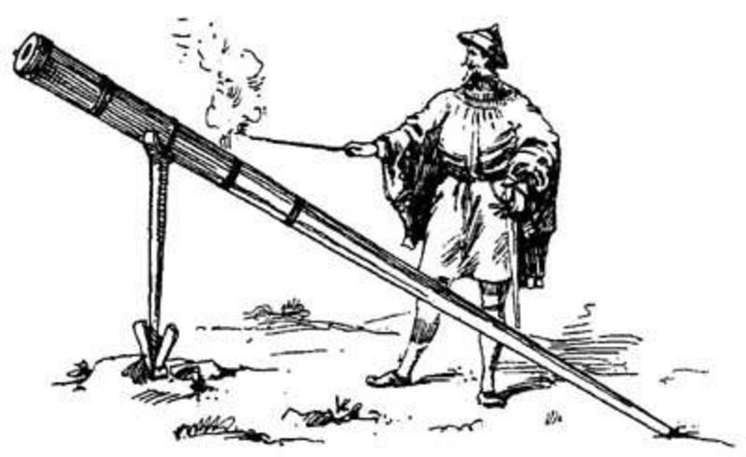 Первые орудия были в основном переносными пушками: простыми трубками или стволами, как правило, из железа или латуни. Они были заряжены спереди порохом и свинцовым шаром. Рядом с запечатанной задней частью, или казенной частью, было небольшое отверстие для воспламенения заряда. В пылу боя поджечь порох вручную через крошечное отверстие было непросто, а дальность действия этих орудий составляла всего около 35 ярдов (32 м), даже если порох действительно воспламенился.