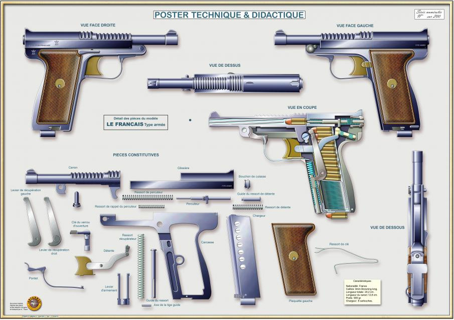 Отпирание происходит при опускании ствола на подвижной серьге. Ударно-спусковой механизм – курковый, одинарного действия, выполнен в виде единого легкосъемного модуля (впервые в мире). Предохранительных устройств нет, для относительно безопасного ношения пистолета с патроном в патроннике имелся предохранительный полувзвод курка, однако при изношенных частях УСМ падение пистолета с курком на полувзводе могло привести к случайному выстрелу. Прицел открытый, нерегулируемый, пистолеты пристреливались на дальность 25 метров. Щечки рукоятки – пластиковые или деревянные, с крупным вертикальным рифлением. В нижней части рукоятки имеется антабка для пистолетного ремня. Питание патронами – из отъемных однорядных коробчатых магазинов емкостью 8 патронов. Защелка магазина – кнопочная, расположена в основании спусковой скобы слева.