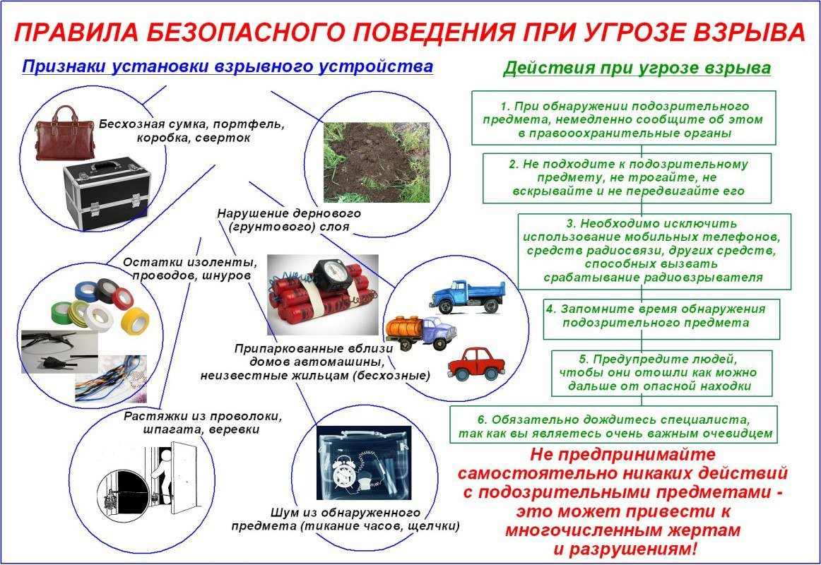 -при обнаружении забытых вещей, не трогая их, сообщите об этом водителю, сотрудникам объекта, службы безопасности, органов милиции. Не пытайтесь заглянуть внутрь подозрительного пакета, коробки, иного предмета;