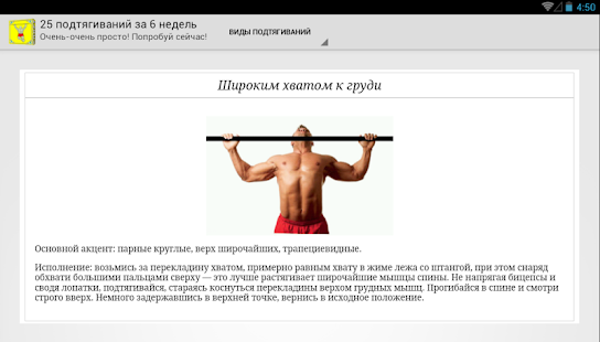 | День 4 — Сделайте 50 повторений в течение дня (сеты до максимума) | 50 повторений |