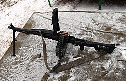 Эта статья про пулемет. О народе, который является его тезкой, см. Печенеги.ПКП «Печенег» (русский язык: Печенег) — российский универсальный пулемет под патрон 7,62 × 54 ммR. [4] Это модернизированный пулемет ПК. Печенег [8] более точен, чем все его предшественники из-за более тяжелого, несъемного ствола с принудительным воздушным охлаждением, радиальных ребер охлаждения и рукоятки, которая устраняет эффект дымки от горячих газов и сохраняет охладитель ствола, повышающий надежность оружия. [8] Кроме того, на оружие может быть установлен оптический прицел или другие прицелы, что увеличивает его точность и дальность действия. Индекс ГРАУ «Печенег» — 6П41 или 6П41Н (Печенег-Н) при наличии планки для крепления прицела ночного видения. В настоящее время «Печенег» в значительном количестве используется спецназом Российской армии и другими войсками.