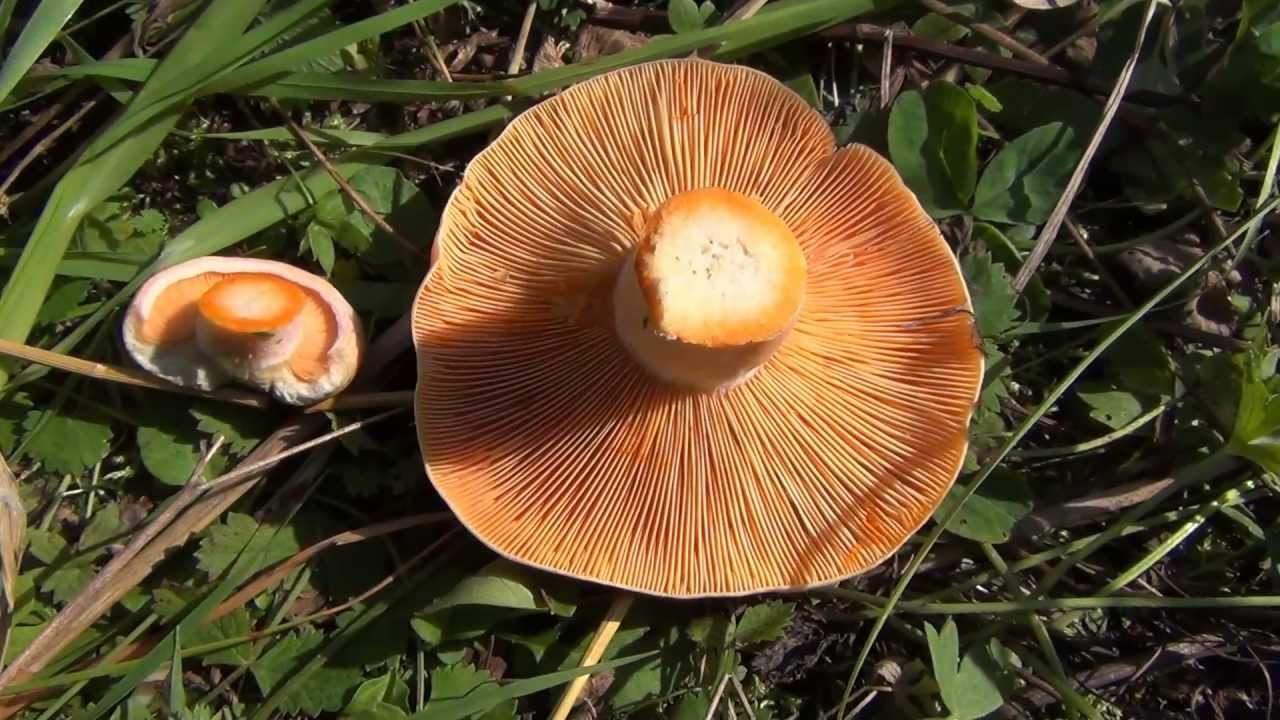 Длина ножки рыжика достигает 3-7 сантиметров, а диаметр варьируется от 1,5 до 2,5 сантиметров. Ножка ломкая, форма ее цилиндрическая, внутри она полая. Шляпка и ножка одного цвета. Если к ножке прикоснуться, она зеленеет. Мякоть оранжевого цвета, ломкая, при изломе становится зеленой. Млечный сок обильный, не жгучий, оранжево-красный, а на воздухе зеленеет. Запах у мякоти приятный – фруктовый. Пластинки приросшие, немного нисходящие, их ширина составляет 0,5-0,9 сантиметров.