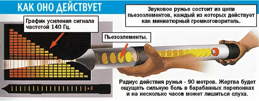 Отметим, что подобное оружие уже давно используется в США. Там в 2000 году была создана акустическая установка LRAD для защиты кораблей от террористов, пиратов и т.д. Она издает страшный рев на низких частотах с уровнем звукового давления 162 дБ (предел для человеческого уха – 120 дБ).