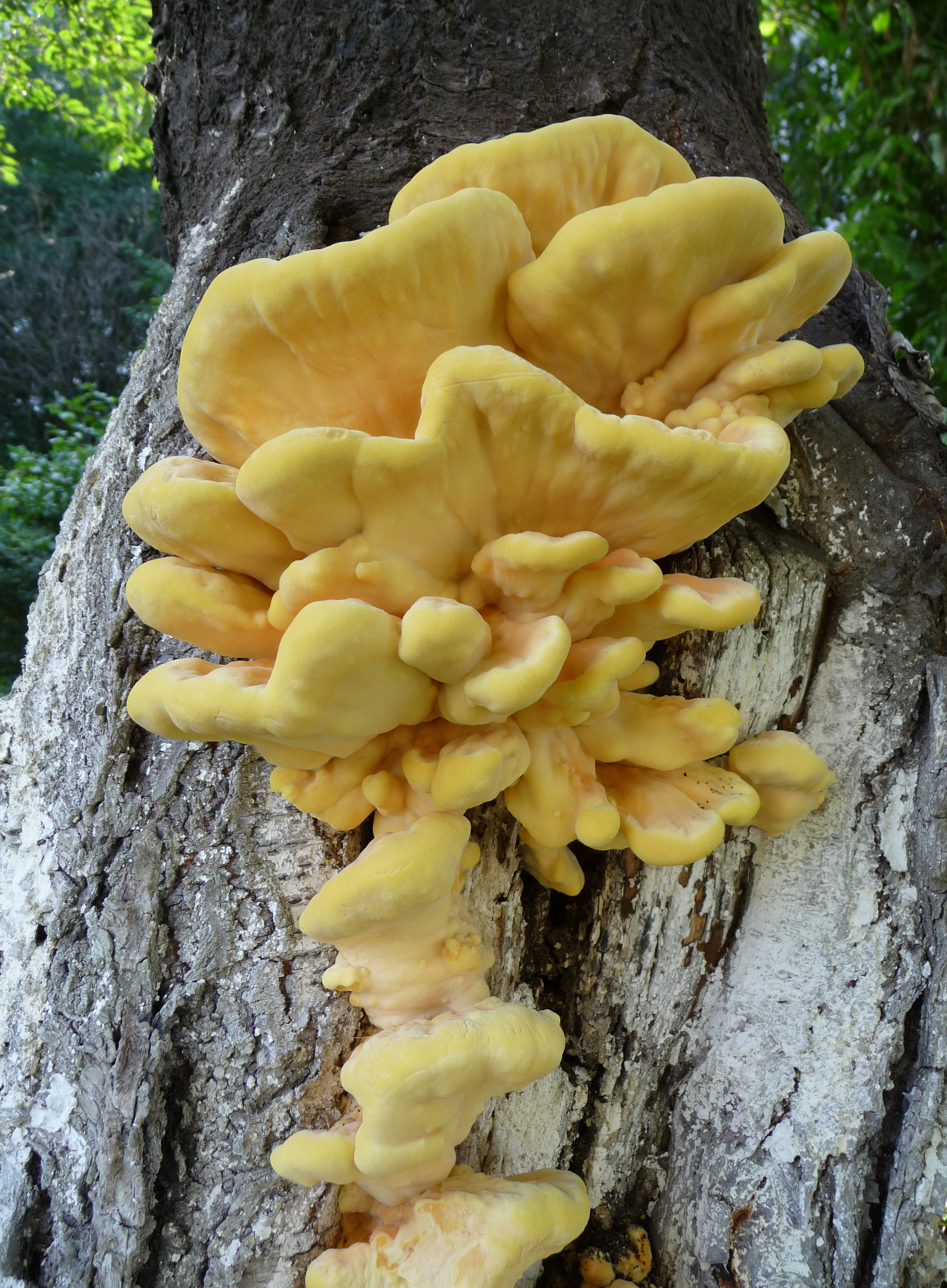 Такой вот красивый гриб – трутовик серно-жёлтый. Считается съедобным, но с оговоркой – «может накапливать токсины». В некоторых странах этот трутовик считается деликатесным грибом, там его даже называют лесной курятиной – при жарке по запаху напоминает куриное филе.