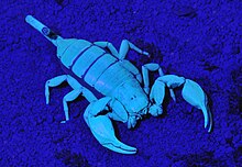 Die Cuticula der Skorpione fluoresziert bei Bestrahlung mit Ultraviolettstrahlung. Dabei werden eingelagerte beta-Carboline и 7-Hydroxy-4-methylcoumarin angeregt.Mit Hilfe entsprechender Lampen können die Tiere daher bei Dunkelheit leicht entdeckt werden. Auch nach dem Ableben der Tiere bleibt dieser Effekt erhalten.