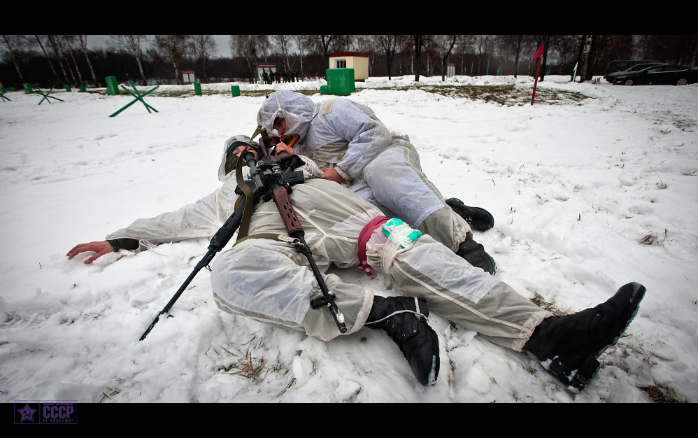 Специальное упражнение было посвящено отработке навыка быстрой эвакуации раненого снайпера из опасной зоны своим напарником. Заметив, что боец попал в беду, коллега по-пластунски подбирается к нему, выясняют чем и куда тот ранен, накладывает жгут, останавливает кровь и перевязывает товарища индивидуальными пакетами. Когда кровь остановлена, а непосредственная опасность гибели от полученного ранения и кровопотери не грозит, необходимо эвакуировать раненого. В процессе эвакуации снайпер должен попытаться все свои действия совершать незаметно для противника, пригибаясь как можно ниже и используя доступные средства маскировки. В нашем случае раненый снайпер был по условиям задачи в сознании, потому получил указание держать обе снайперские винтовки на себе и помогать при переползании, толкаясь «здоровой» ногой.