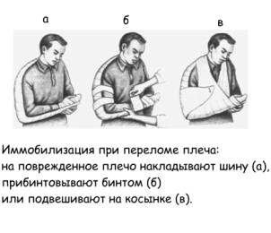 Иммобилизацию можно осуществить с помощью пращевидной повязки, проведенной под