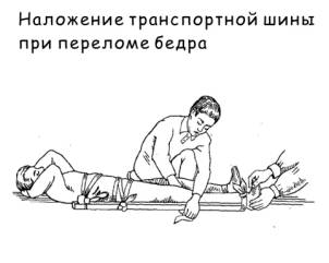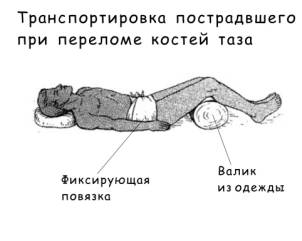 Транспортировать больного следует уложив на ровную твердую поверхность, ноги согнуть в коленях и бедра несколько развести в стороны, а под колени наложить тугой валик из подушки, одеяло, одежды и т. д. высотой 25-30 см. Транспортировать пострадавшего на носилках или твердом щите на спине. Ноги зафиксировать.