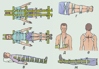 Рис.1. Иммобилизация при помощи подручных средств: а, б — при переломе позвоночника; в, г — иммобилизация бедра; д — предплечья; е — ключицы; ж — голени.