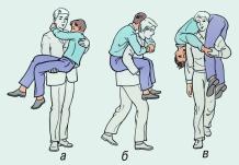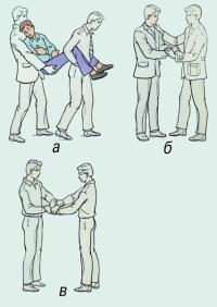 Рис. 4. Переноска пострадавшего двумя носильщиками: а — способ «друг за другом»; б — «замок» из трех рук; в — «замок» из четырех рук.