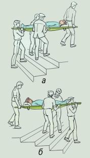 Пострадавших и больных, находящихся в бессознательном состоянии, транспортируют в положении лежа на животе, с подложенными под лоб и грудь валиками. Такое положение необходимо для предотвращения асфиксии. Значительную часть больных можно транспортировать в положении сидя или полусидя. Необходимо также следить за правильным положением носилок при подъеме и спуске по лестнице. При транспортировке в холодное время года надо принять меры для предупреждения охлаждения пострадавшего, т.к. охлаждение почти при всех видах травмы, несчастных случаях и внезапных заболеваниях резко ухудшает состояние и способствует развитию осложнений. Особого внимания в этом отношении требуют раненые с наложенными кровоостанавливающими жгутами, пострадавшие, находящиеся в бессознательном состоянии и в состоянии шока, с отморожениями. период транспортировки необходимо проводить постоянное наблюдение за больным, следить за дыханием, пульсом, сделать все, чтобы при рвоте не произошла аспирация рвотных масс в дыхательные пути. Очень важно, чтобы оказывающий первую помощь своим поведением, действиями, разговорами максимально щадил психику больного, укреплял в нем уверенность в благополучном исходе заболевания.