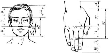 Из точки В восстанавливается перпендикуляр, равный половине АВ. Полученная точка С соединяется отрезком с точкой А. На отрезке AC от точки С откладывается отрезок, равный ВС, заканчивающийся точкой D. На отрезке AB от точки А откладываем отрезок АЕ, равный отрезку AD. Полученная при этом точка Е делит отрезок АВ в соотношении золотой пропорции. Отрезки золотой пропорции выражаются бесконечной иррациональной дробью AE = 0,618…, если АВ принять за единицу, ВЕ = 0,382… Для практических целей часто используют приближенные значения 0,62 и 0,38. Если отрезок АВ принять за 100 частей, то большая часть отрезка равна 62, а меньшая – 38 частям.