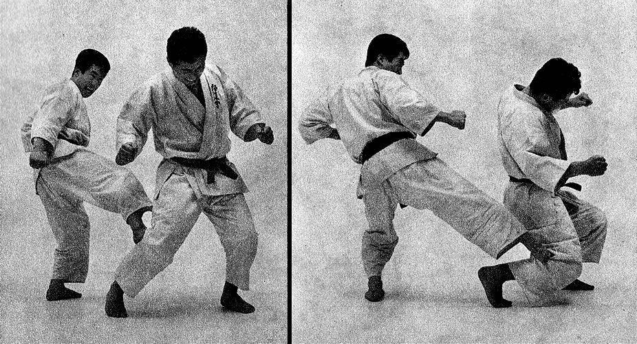 Против борца, который стоит в стойке, Брюс применяет следующую комбинацию: он поднимает ведущую руку, чтобы ввести противника в заблуждение, и быстро продвигается вперед, чтобы нанести низкий удар ногой в колено, опрокидывая тем самым «противника на пол, но держа и дальше ногу у колена противника. Посмотрите как далеко стоит Брюс от своего противника в момент начала удара.