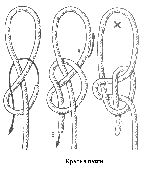 “Пьяный” узел (рис. 89). В этом разделе узлов имеются узлы с двумя затягивающимися петлями. Когда тянут одновременно за ходовой и коренной концы, петли затягиваются. Этот узел на Руси испокон веков назывался “пьяным”: видимо, его применяли для усмирения не в меру разгулявшихся людей, надевая петли на запястья рук за спиной и связывая концы на груди.