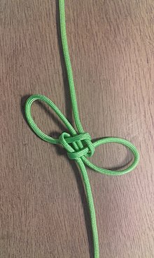 - Также нужно пропустить через первую петлю второй конец веревки и вытянуть его. Далее его нужно завести под образовавшимся узлом, проходя через его центр.