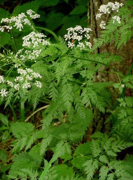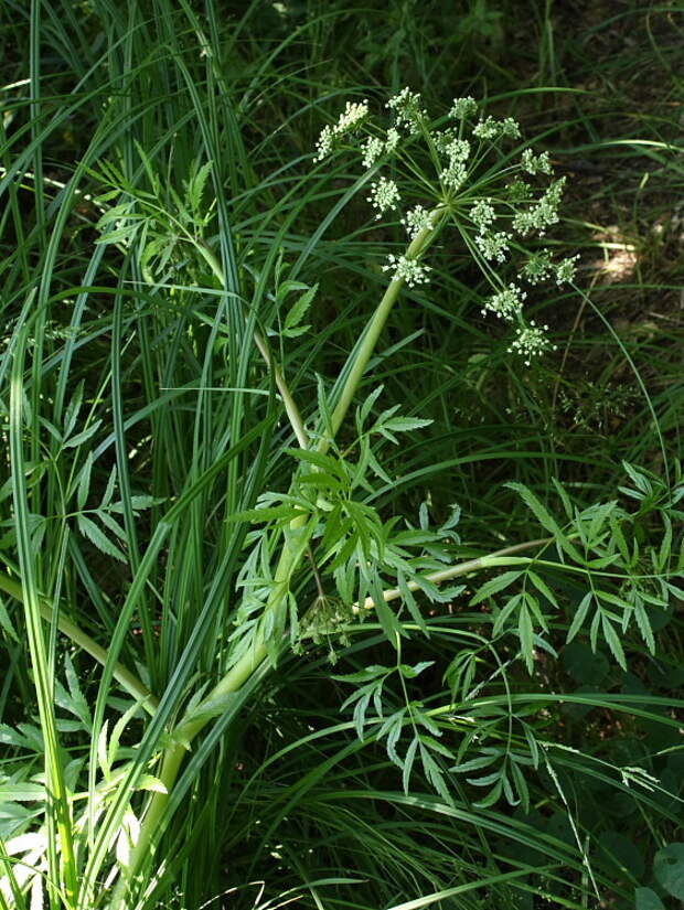 По берегам рек и в других влажных местах встречаются зонтики со стеблями в пурпурную крапинку, листьями, похожими на петрушку или морковь, и неприятным «мышиным» запахом.