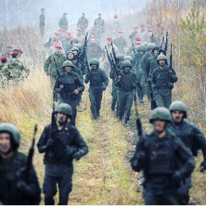 По ходу марш-броска все время идут упражнения, команда «Газы!» — бойцы надевают противогазы и бегут в них…