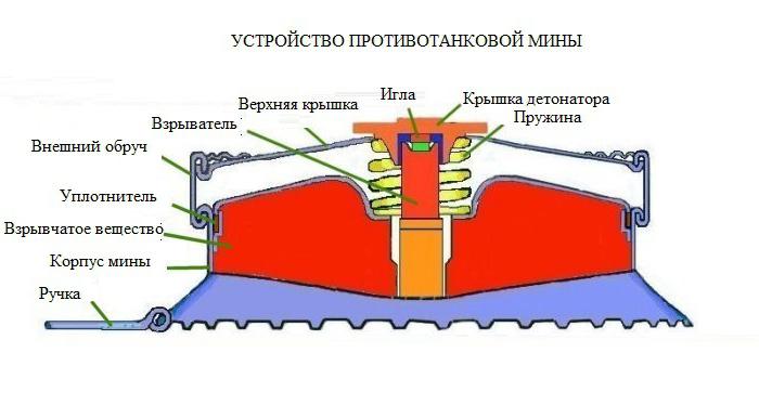 Состоит из стального корпуса, с размещенным в нем зарядом ВВ, и контактного или не контактного взрывателя. Для подрыва мины используются взрыватели: МВЧ — 62, МВЗ — 62, МВШ -62, МВД — 62, МВН — 80. Взрыватель ввинчивается в отверстие сверху корпуса мины. В походном положении это отверстие закрывается пластмассовой крышкой. Мина обладает повышенной устойчивостью к воздействию ударной волны ядерного взрыва и взрыва зарядов разминирования.