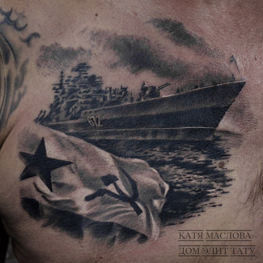 Для моряков популярными являются военные татуировки, эскизы которых содержат следующие символы: белый медведь, штурвальное колесо, якорь, парусник и другие элементы с информацией о части и месте службы.