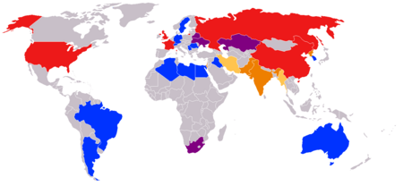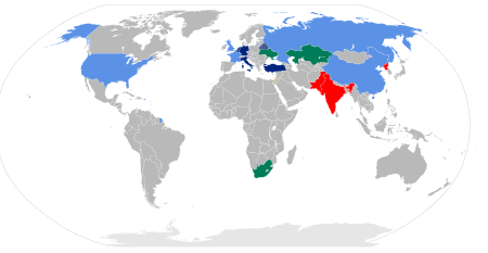 Государства, обладающие ядерным оружием Государства, предоставляющие свою территорию для размещения ядерного оружия других ядерных держав Государства, состоящие в альянсах с государствами, обладающими ядерным оружием (по сути, находящиеся под ядерным зонтиком) Государства-члены соглашения о безъядерных зонах. Государства, которые подписали, но не ратифицировали соглашение о безъядерных зонах, которое остаётся не вступившим в силу в этих государствах