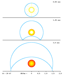 В результате ядерного взрыва при огромных температурах происходит увеличение давления в зоне реакции. За короткое время огненный шар достигает значительных размеров. К концу третьей секунды с момента взрыва ядерного боеприпаса средней мощности огненный шар достигает в поперечнике примерно 300 м.